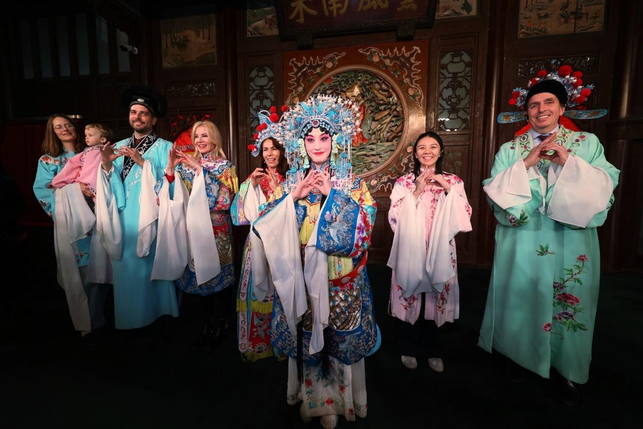 欣赏完演出,使节们又兴致盎然地体验了制作漆扇这一传统工艺。新加坡驻华大使馆新闻官蒋海璇亲自上手,在专业人员指导下,不一会儿,一把色彩斑斓、图案精美的漆扇便在她手中诞生。紧接着,驻华使节们纷纷穿上戏服,扮成了京剧里的生旦净末等角色,他们学着有模有样地甩起水袖,夸张的动作,引得现场笑声、叫好声不断。参观最后,使节们齐声送上真挚的祝福:“新年快乐!”