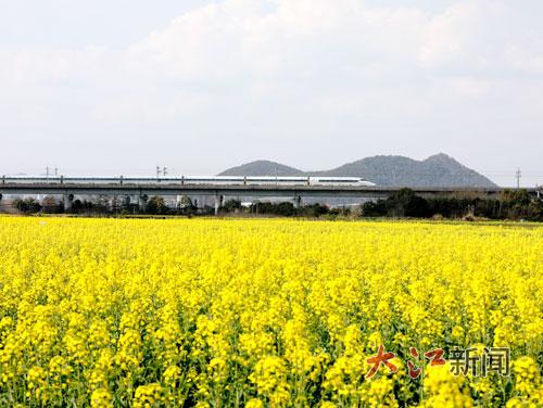 一趟动车组列车在油菜花海中疾驰而过。 大江网视觉江西袁建兵摄