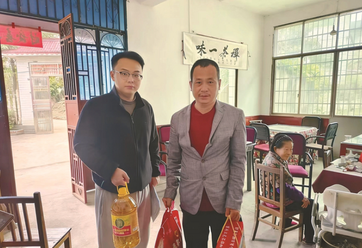 春节期间,文子翰(左)走访村里的脱贫户。(作者供图)