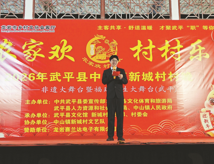 王茂炜在新城村村晚担任主持人。(作者供图)