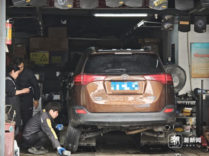 记者在一家轮胎店看到,四五个伙计几乎忙得脚不沾地:一位师傅正麻利地拆卸轮胎准备修补,还有员工穿梭在排队等待的车辆间进行快速洗车。“换个胎、补个漆,很多客人会直接来我们这里。”店老板说。