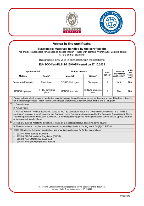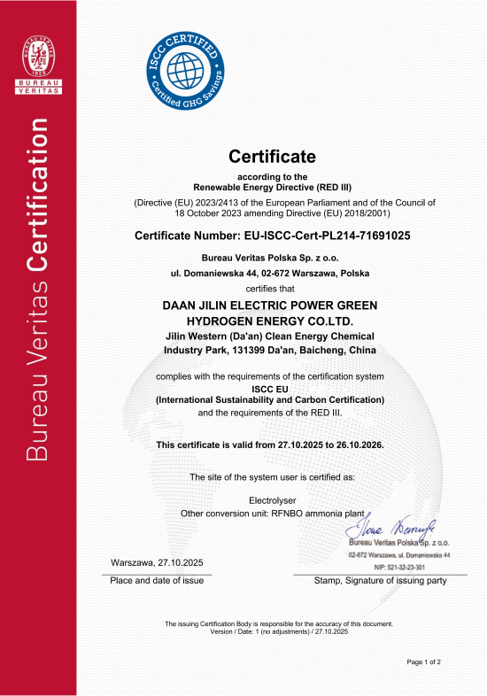全球首张ISCC EU非生物来源可再生燃料氨认证证书