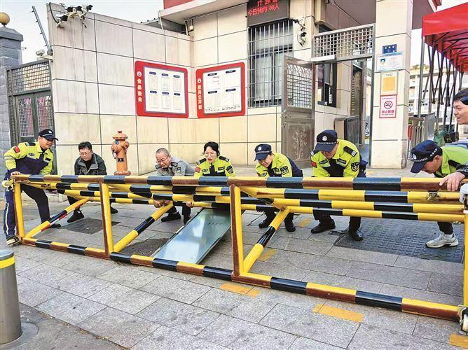 校门口道闸意外倾倒,队员们齐心协力将其扶起。