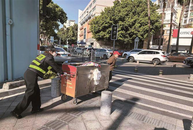 去年12月28日上午,莲前西路与云顶中路路口文明岗队员陈秋娥执勤时,发现一位老人正费力地拉着早餐车缓慢前行,她主动帮忙推车,一路护送老人走过十字路口,才放心返回执勤岗位。