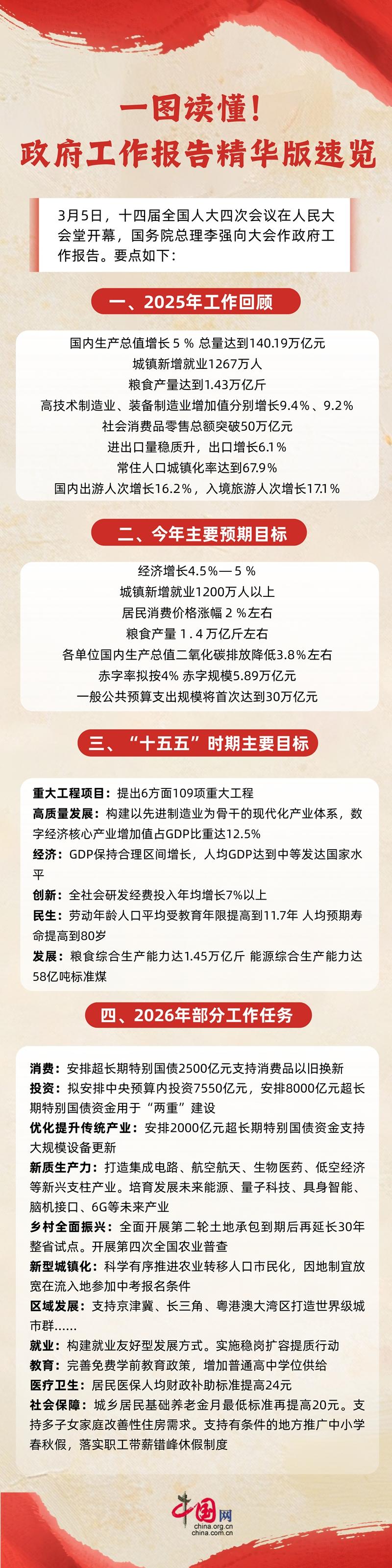 图说报告 | 一图读懂!政府工作报告精华版速览 2026-03-05 14:24 来源:中国网 总监制:薛立胜监制:蔡晓娟整理:马旷制图:沈思妤编审:刘洪庆 蔡晓娟中国网新闻评论部出品【责任编辑:马旷】