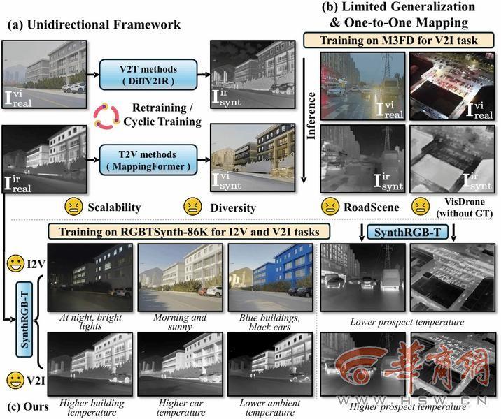 论文概述:弥合红外图像与可见光图像之间的模态差异,对于实现跨模态理解及丰富多模态基准数据具有重要意义。然而,现有研究方法多局限于一对一映射范式,且通常仅在单向或封闭场景中进行评估,难以满足复杂开放环境下的多样化需求。针对上述问题,论文将图像转换过程创新性地表述为一种由视觉与语言共同引导的去噪扩散过程。通过引入开放世界知识,实现了可控的双向图像翻译。此外,所提出的 SynthRGB-T 模型能够合成多样性强且高保真度的数据样本,显著拓展了多模态数据资源的规模与丰富度,为多模态领域后续研究提供了有力支撑。