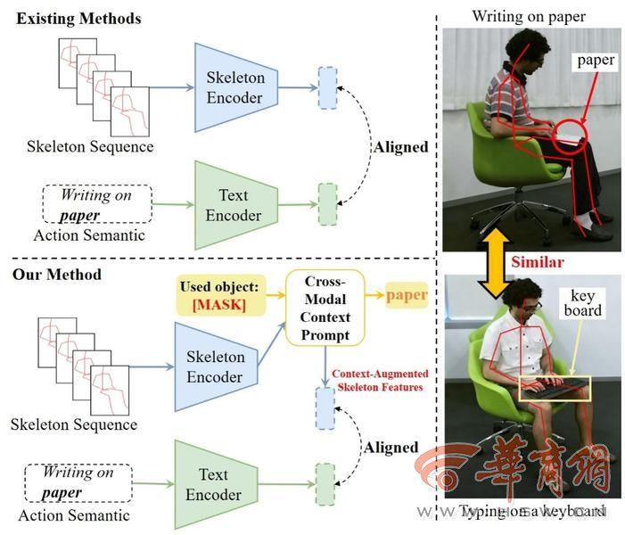 论文概述:针对零样本(Zero-shot)骨骼动作识别中因缺乏环境上下文(如交互物体)导致动作语义模糊、难以区分视觉相似动作的挑战,论文提出了一种基于提示学习的新框架 SkeletonContext。该框架通过引入“跨模态上下文提示模块”,利用大语言模型(LLM)生成的丰富背景语义来补全骨骼动作中的缺失信息,实现了骨骼特征与语言描述的深层语义对齐;同时,结合“关键部位解耦模块”提取运动相关关节特征,进一步增强了在无物体交互场景下对复杂动作的理解能力。在多个主流基准数据集上的实验结果表明,SkeletonContext 在传统及广义零样本任务中均达到了领先水平,显著提升了模型对细粒度动作的推理精度与鲁棒性。