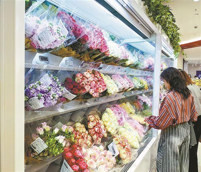 各大商场景区纷纷推出优惠活动,鲜花依旧是热卖品项。图为市民在天虹超市选购鲜花。