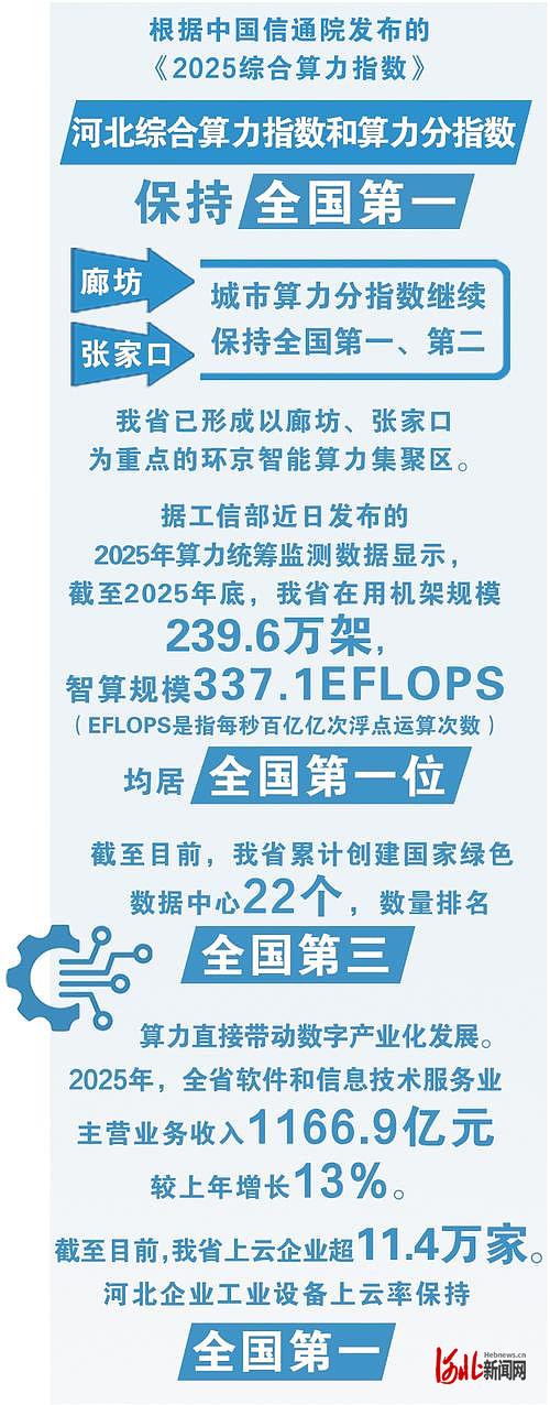 根据中国信通院发布的《2025综合算力指数》,河北综合算力指数和算力分指数继续保持全国第一,廊坊、张家口城市算力分指数继续保持全国第一、第二。