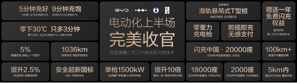 要解决这些根源性问题,关键看电池。六年磨一刀,比亚迪正式推出第二代刀片电池,带来了颠覆性的闪充体验,实现“常温充电,5分钟充好,9分钟充饱;低温充电,零下30度,只多3分钟”,让充电和加油一样快。