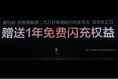 发布会现场,王传福还宣布:所有搭载第二代刀片电池的闪充车车主,均享有重磅“闪充权益”,自交车之日起,在全国闪充站可享受1年的免费闪充权益,让闪充体验更畅快。并且,在闪充免费期结束后,也会同行业保持一致,不会额外收费。