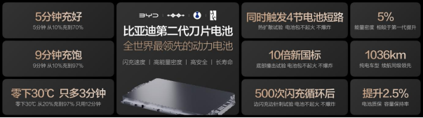 比亚迪第二代刀片电池,既给到用户前所未有的闪充速度,又给到用户超1000公里的超长续航,还给到用户更长的寿命和更高的质保政策,更给到用户远超新国标的安全。