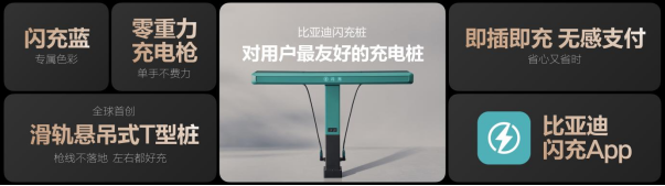传统公共充电桩枪重、线脏、移动不灵活,充电流程还很繁琐,为了解决这些痛点,比亚迪闪充桩采用了全球首创的“滑轨悬吊式T型桩”设计,让线拉着枪,手感非常轻巧,几乎是“零重力充电枪”;并且,枪线永远保持悬空,避免缠绕更干净;还可以让用户轻松左右滑动,充电更灵活。同时,比亚迪还打通了车和桩之间的所有链路,只需通过比亚迪闪充APP简单设置,即可实现“即插即充,无感支付”。