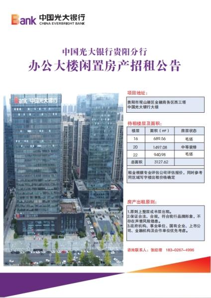 中国光大银行贵阳分行办公大楼闲置房产招租公告