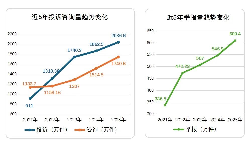 中国网3月16日讯 据市说新语微信公众号消息,2025年,全国市场监管部门通过全国12315平台、电话等渠道共受理消费者投诉、举报和咨询4386.6万件(投诉举报2646万件,同比增长9.8%),其中投诉2036.6万件,同比增长9.3%;举报609.4万件,同比增长11.4%;咨询1740.6万件,为消费者挽回经济损失43.5亿元,有力保护了消费者合法权益。主要呈现十大特点: