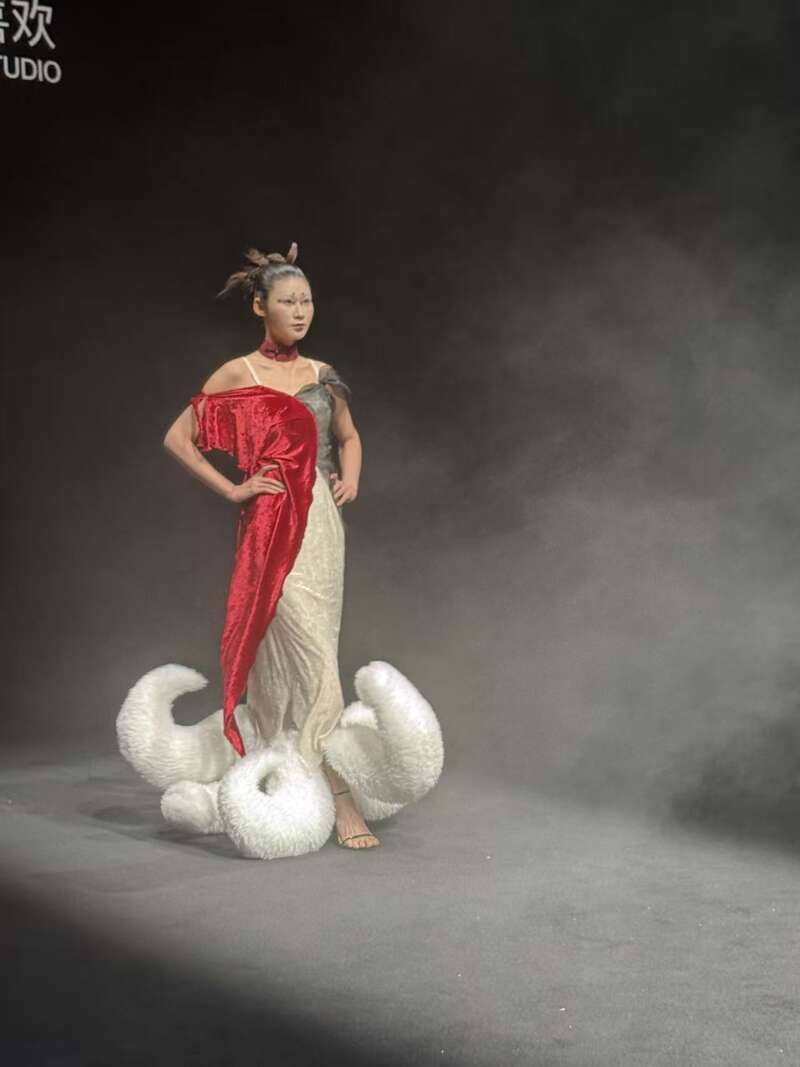 小设计师将《山海经》中的“九尾狐”元素融入服装设计,用极致的色彩碰撞与夸张廓形重构出神兽的视觉冲击力。中青报·中青网记者夏瑾/摄