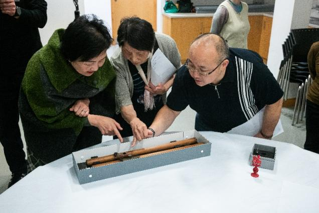 Sally Gillespie、Selina Lee和Stephen Lam正在查看竹制鸦片器具。北爱尔兰国家博物馆藏品,编号B009759.5。摄影:倪旸。
