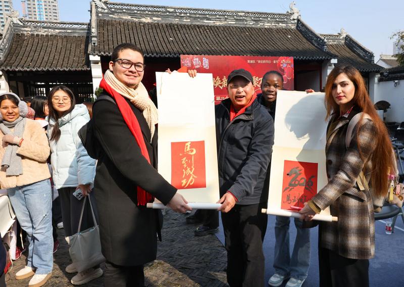 2月12日,“门焕新颜·联聚万家”第二十一届老西门春联大会在上海文庙拉开帷幕。来自巴西的留学生爱德华(前左)在展示他获赠的马年主题书法作品。新华社记者 方喆 摄