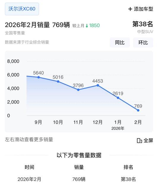 作为沃尔沃史上最畅销车型,XC60曾长期支撑品牌销量,2025年其月零售量基本保持在3700—8000辆区间,2025年6月更是创下7179辆的全年销量峰值。但进入2026年,XC60销量出现大幅下滑,2026年1月-2月零售量仅3388辆,较2025年1-2月9977辆,同比大跌66%。