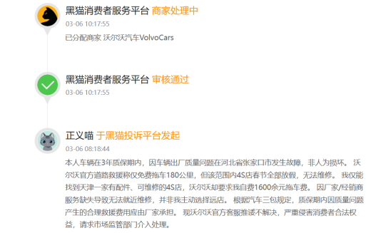 除了被车主们诟病的质量问题外,鲁网记者在黑猫投诉平台发现,关于其售后的缺位投诉也不在少数。一位车主反映自己的车在河北张家口因出厂质量问题出故障,官方免费拖车范围的 4S 店春节放假无法维修,仅天津有 4S 店可修,沃尔沃却要求车主自费 1600 余元拖车费,车主按三包规定要求厂家承担合理费用,诉求遭客服推诿。