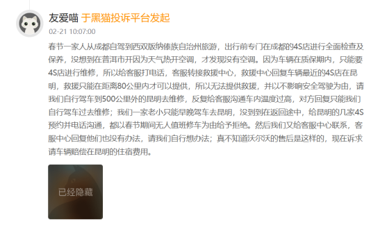 另有车主春节从成都自驾西双版纳,出行前做过全面检修,却在普洱出现空调故障,官方以救援仅限 80 公里、故障不影响安全为由,让车主自行开 500 公里到昆明维修,驱车前往后,昆明多家 4S 店又以春节无人值班拒修,客服也表示无能为力,车主要求赔偿昆明住宿费用,至今无回应。