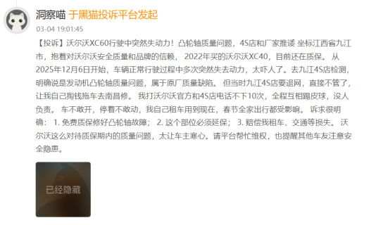 3月14日,本网曾对沃尔沃凸轮轴集体投诉进行报道(https://baijiahao.baidu.com/s?id=1859634341981063401&wfr=spider&for=pc)。故障主要涉及 2022 款至 2026 款搭载轻混 B 系列发动机的沃尔沃 S90、S60、XC60 等主力车型,XC60 正是该故障的主要爆发车型之一,多位车主不仅遭遇核心部件质量问题,还频频陷入售后维权难的困境。