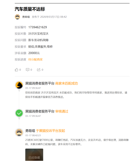 鲁网记者发现,在第三方投诉平台上,沃尔沃XC60的投诉量仍在持续攀升。在黑猫投诉平台,搜索“沃尔沃XC60”可看到凸轮轴损坏导致故障灯亮、行驶中突然失速、发动机故障、质量不达标等投诉。