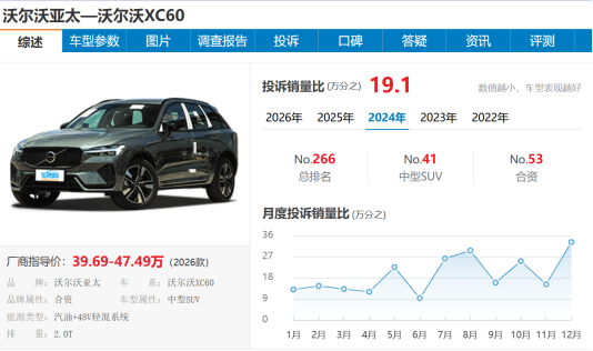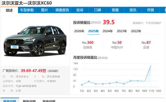 车质网数据显示,沃尔沃 XC60 近三年投诉销量比呈明显上升趋势(数值越小车型表现越好),2024年为万分之19.1,2025年大幅攀升至万分之39.5,车型质量表现显著下滑。其中质量问题投诉主要集中在凸轮轴故障引发故障灯亮、电瓶亏电无法启动、车机系统故障等方面;服务问题投诉则以宣传与实际不符、销售承诺不兑现为主。
