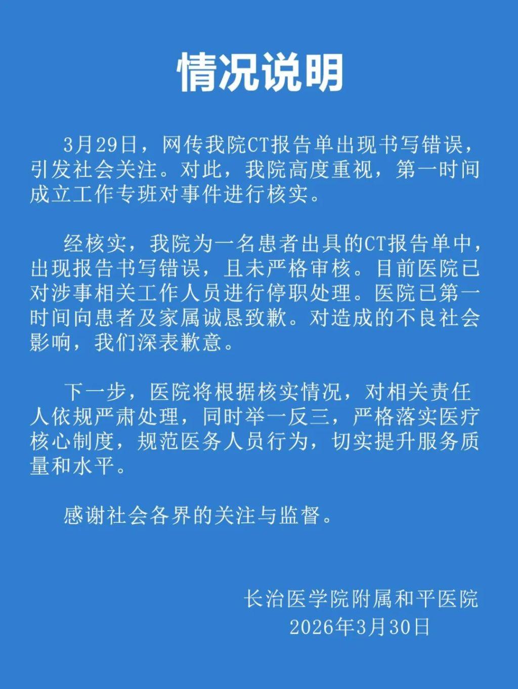 3月30日,长治医学院附属和平医院发布“情况说明”称,经核实,该院为一名患者出具的CT报告单中,出现报告书写错误,且未严格审核。目前,医院已对涉事相关工作人员进行停职处理,并向患者及家属诚恳致歉,对造成的不良社会影响深表歉意。