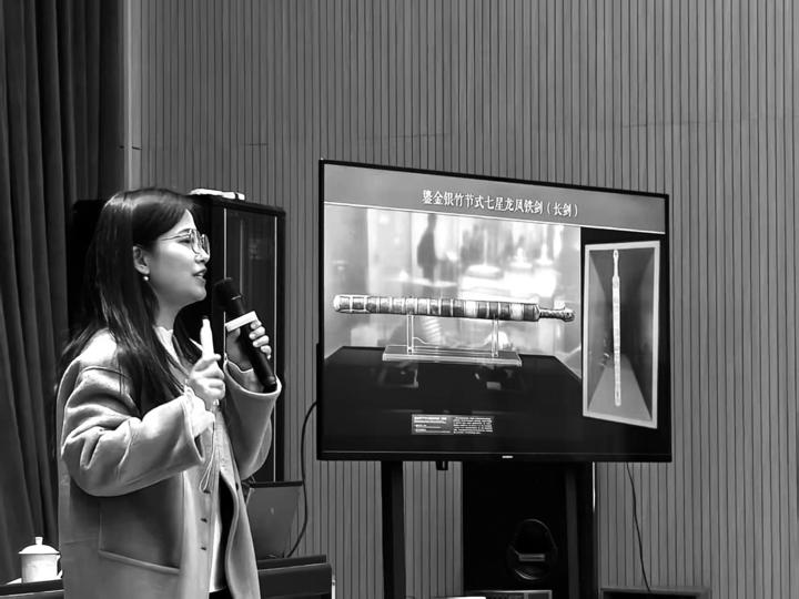 讲到那把鎏金银竹节式七星龙凤铁剑时,董菁菁用了一个形象的比喻:“为了看清它内部的秘密,博物馆的专家们还给它拍过‘X光片’呢。”文物如何能拍X光片?原来,专家们是利用特殊的扫描设备,得到剑体内部的透视图,通过透视图,专家惊喜地发现,宝剑内部竟然刻着龙、凤、北斗七星,还有一个拿剑的武士图案!孩子们惊呼,原来文物背后还藏着这么多“黑科技”。