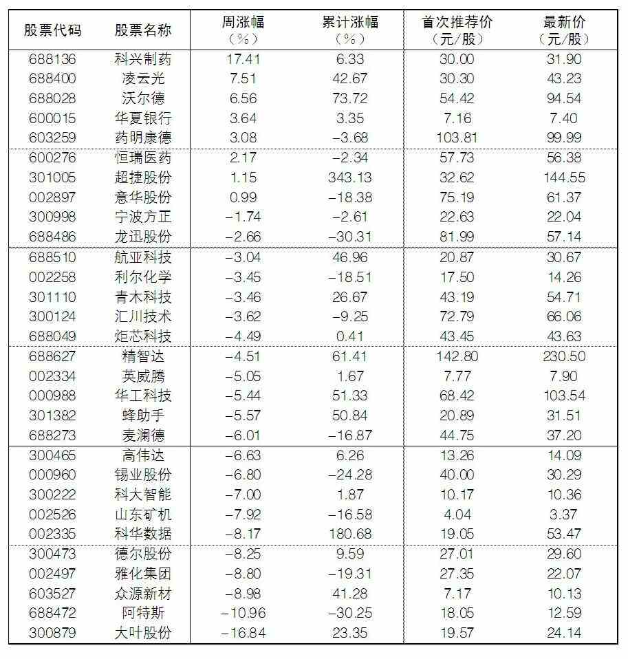大众30指数成份股中,本周涨幅前五位的分别是科兴制药、凌云光、沃尔德、华夏银行、药明康德,涨幅分别为17.41%、7.51%、6.56%、3.64%和3.08%;跌幅榜上,大叶股份、阿特斯、众源新材、雅化集团等跌幅居前。