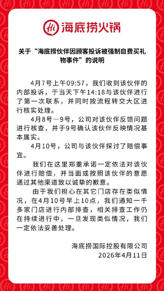 海底捞最新通报“强制员工自费买礼物”事件:共四起涉及1237.9元已全部返还,未来将弱化门店考核 2026-04-14 07:39 来源:杭州网 13日晚间,海底捞火锅官微发布关于“伙伴自费买礼物事件”的核查跟进汇报。全文如下: 11日晚,海底捞火锅官微曾发布关于“海底捞伙伴因顾客投诉被强制自费买礼物事件”的说明。