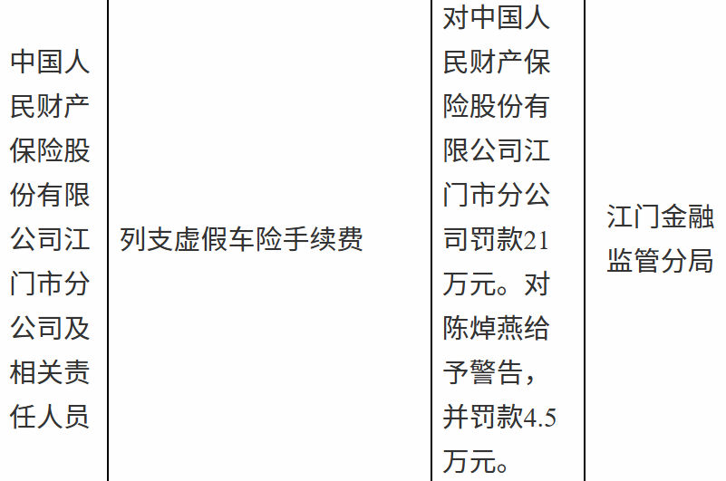 中国人民财产保险江门市分公司因列支虚假车险手续费被罚款21万元 责任人同步领罚 2026-04-15 17:35 来源:东方资讯银保频道 4月15日,国家金融监督管理总局江门监管分局行政处罚信息公示列表显示,中国人民财产保险股份有限公司江门市分公司因列支虚假车险手续费被罚款21万元。责任人陈某燕被给予警告,并罚款4.5万元。