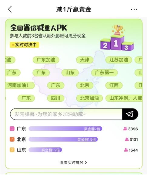 4月15日上线的全国省份减重大PK,将个人减重与集体荣誉深度绑定。活动期间,京东健康实时统计各省份参赛人数,全程公开透明。最终参与人数排名前三的省队,其所在省份的所有参赛用户均可公平参与额外奖金池的现金瓜分。这意味着,每一位用户的每一次打卡、每一斤减重,都在为自己赢得奖励的同时,为家乡的排名贡献力量。
