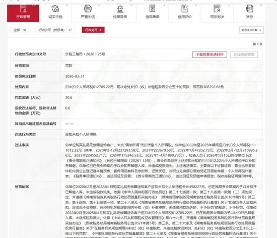 4月16日,信用中国官网显示,湖南三湘银行因2020年2月至2025年4月购买礼品无偿赠送客户、未按“偶然所得”代扣代缴个人所得税,被国家税务总局长沙市税务局第三稽查局处以30.64万元罚款(长税三稽罚﹝2026﹞25号)。经查,该行上述期间应扣未扣个税合计111.10万元,其中2020年2月至2022年1月涉及49.83万元,因在限期内补扣解缴未造成税款流失不予处罚;2022年2月至2025年4月涉及61.28万元,已补扣解缴,按规定处50%罚款计30.64万元。