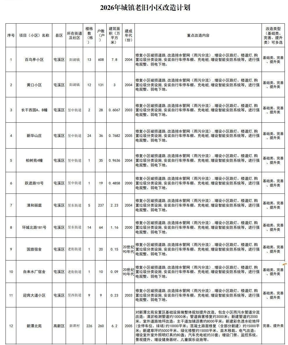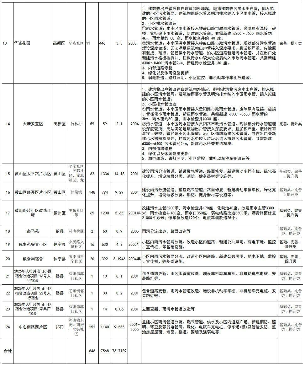 黄山市今年计划改造24个老旧小区 2026-04-16 21:39 来源:大皖新闻 大皖新闻讯 日前,据黄山市住房和城乡建设局消息,2026年黄山全市计划改造城镇老旧小区24个,改造建筑面积76.7139万平方米,涉及住户7568户。 2026年,全市老旧小区改造应在全面实施基础类改造的基础上,全部按照完善类、提升类进行改造。要突出“楼道革命”“环境革命”“管理革命”三个重点,围绕“一老一小”加强小区适老化、适儿化、无障碍设施改造,结合完整居住社区建设,增设片区老年助餐、健身休闲、汽车充电桩、智能信报箱等公共服务设施。大皖新闻记者 吴永泉编辑 陶娜