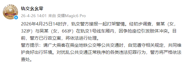 两女子因争抢座位引发肢体冲突 警方已行政立案 2026-04-26 14:57 来源:中国网 中国网4月26日讯 据上海市公安局城市轨道和公交总队官方微博“轨交幺幺零”消息,2026年4月25日14时许,轨交警方接报一起打架警情。经初步调查,曾某(女,32岁)与吴某(女,66岁)在轨交1号线车厢内,因争抢座位引发肢体冲突。目前,警方已行政立案,将依法进行处理。警方提示:请广大乘客在乘坐地铁公交等公共交通时,自觉遵守相关规定,共同维护良好出行环境。对扰乱公共交通正常秩序的各类违法犯罪行为,警方将严格依法查处。 【责任编辑:李平书】